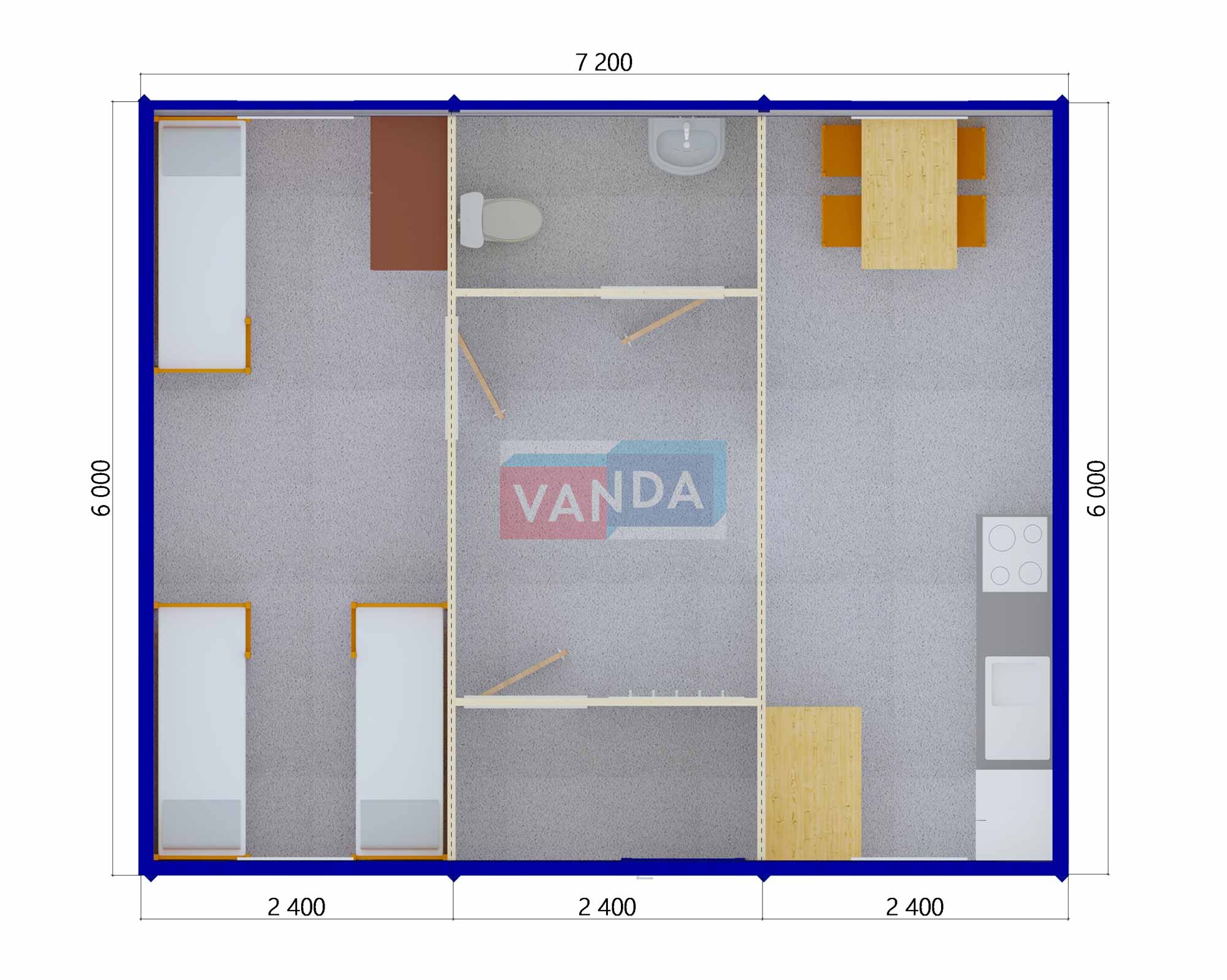 Модульная бытовка с плоской крышей 7.2x6.0 7.2x6.0 43.2 OSB 9 мм. Оцинкованный профлист 650 000 р. Уточняйте у менеджера